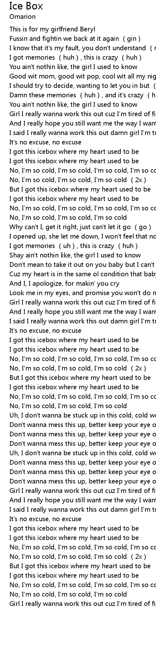 | [01:14.860] | I got this icebox where my heart used to be |