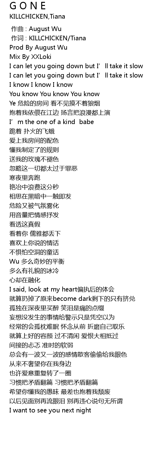 | [00:01.000] | 作词 : KILLCHICKEN/Tiana |