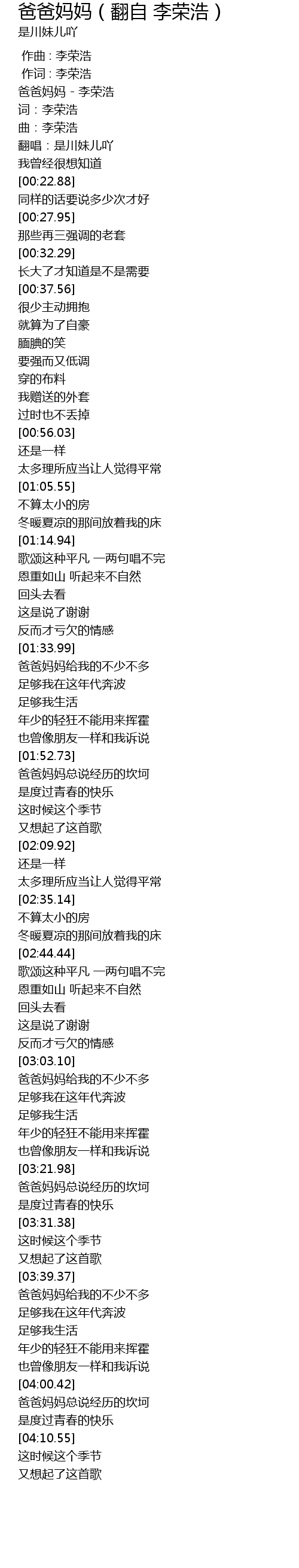 | [00:00.87] | 爸爸妈妈 - 李荣浩 |