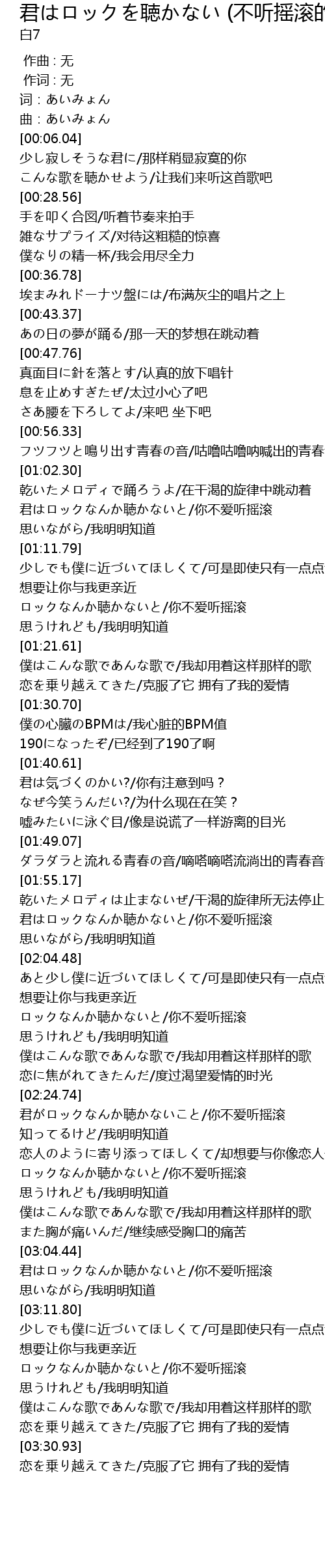 | [02:00.11] | 君はロックなんか聴かないと/你不爱听摇滚 |