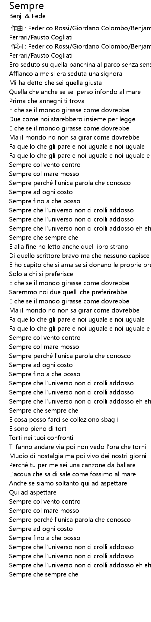 | [00:01.000] | zuò cí : Federico Rossi Giordano Colombo Benjamin Mascolo Walter Ferrari Fausto Cogliati |