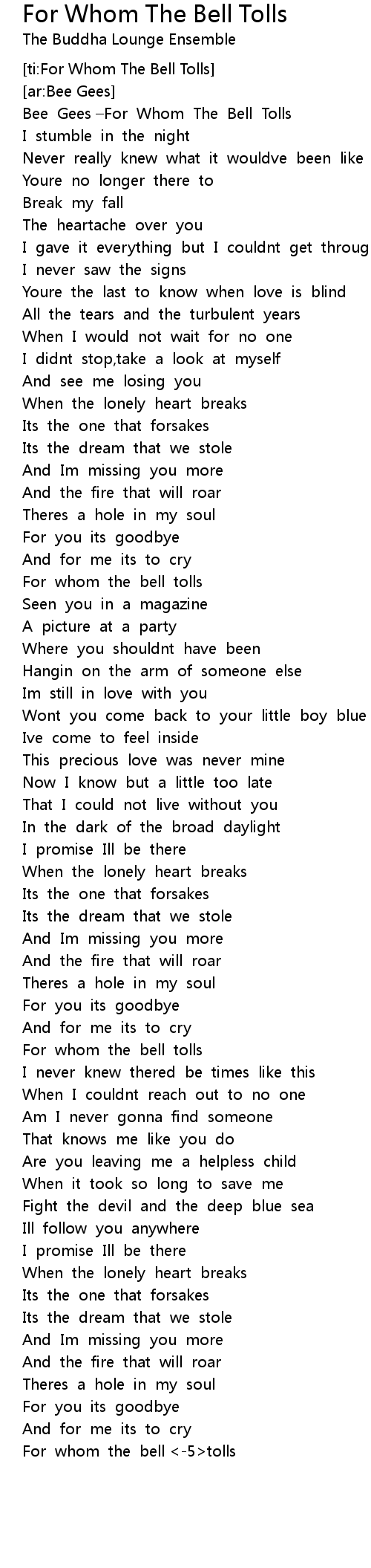 | [00:01.29] | Bee Gees For Whom The Bell Tolls |