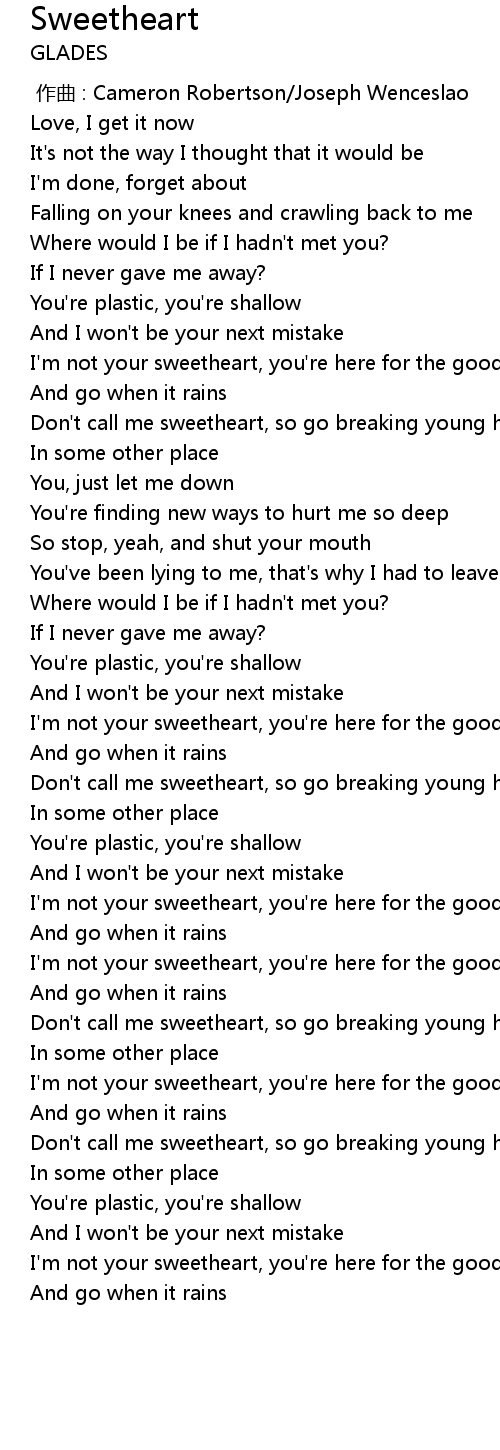 | [02:31.59] | Don't call me sweetheart, so go breaking young hearts |