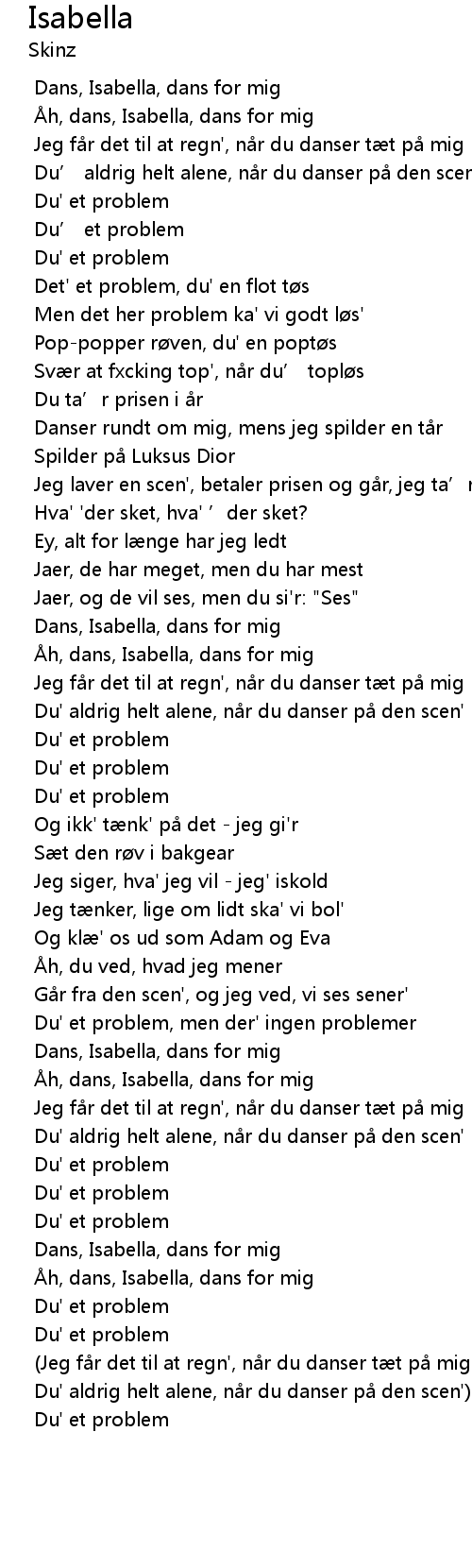 | [00:13.832] | Åh, dans, Isabella, dans for mig |