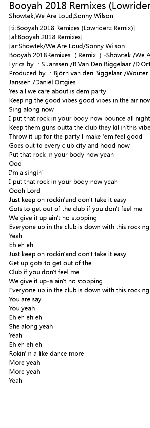 | [00:00.00] | Booyah 2018Remixes Remix Showtek We Are Loud Sonny Wilson |