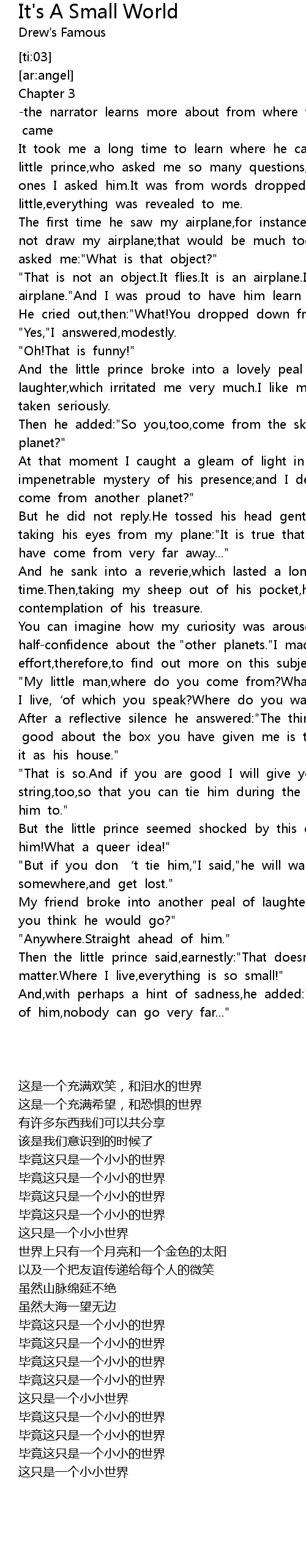 | [00:02.211] | -the narrator learns more about from where the little prince came |