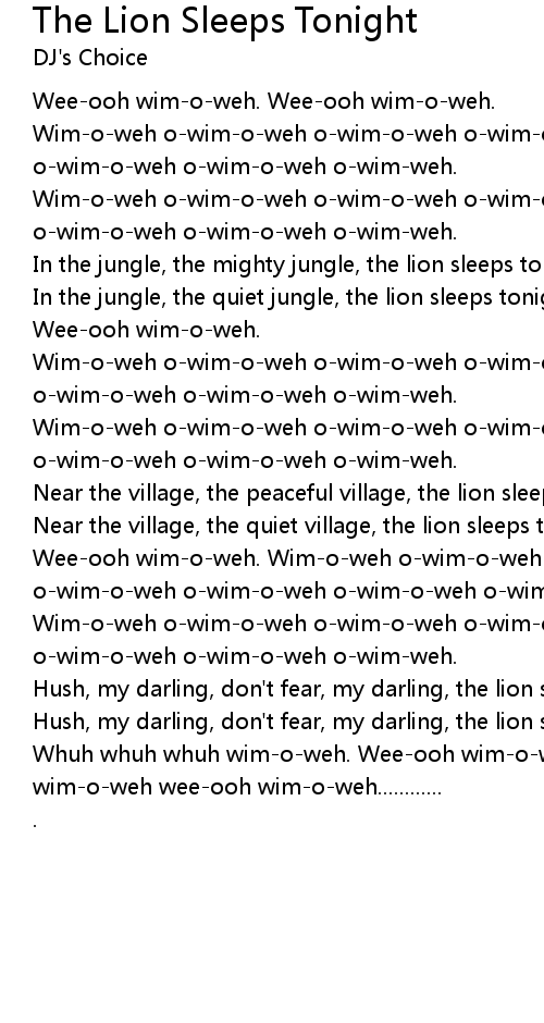 In the jungle, the mighty jungle, the lion sleeps tonight. |