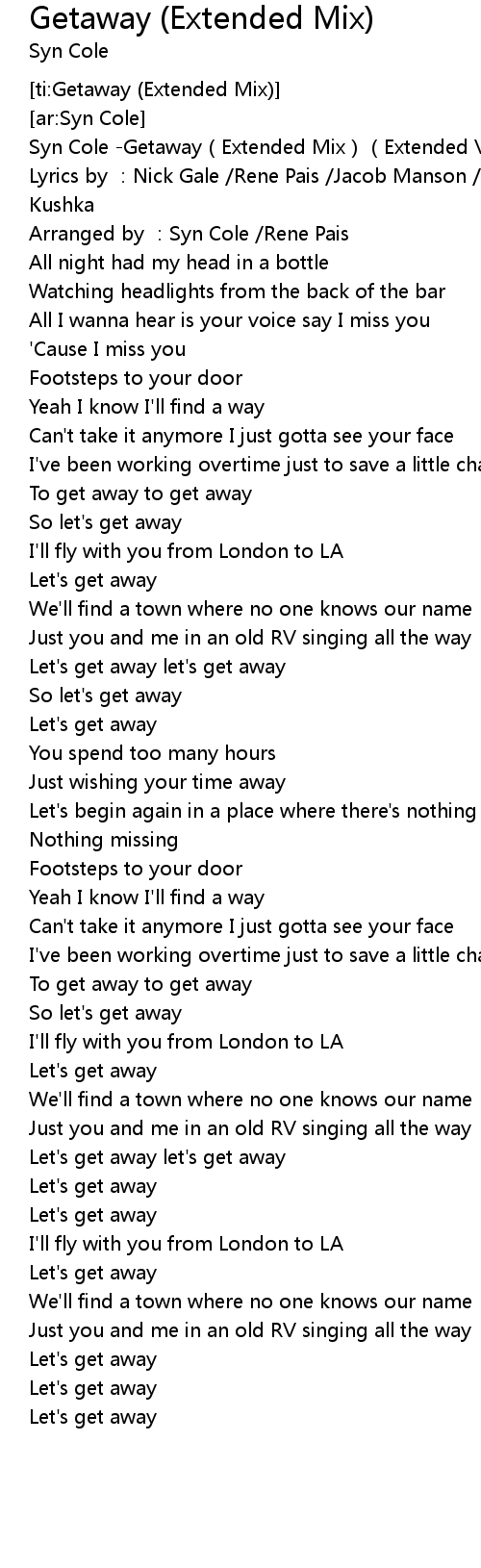 | [00:00.160] | Syn Cole Getaway Extended Mix Extended Version |