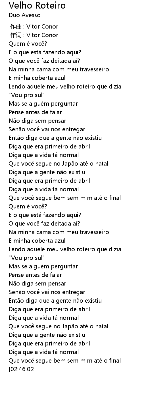 | [01:56.61] | Lendo aquele meu velho roteiro que dizia |