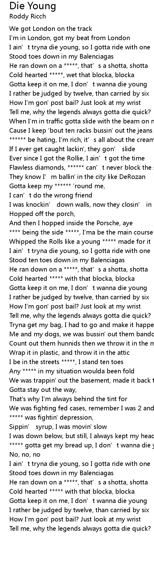 | [02:08.11] | ***** gotta get my bread up, I don’t wanna die young |