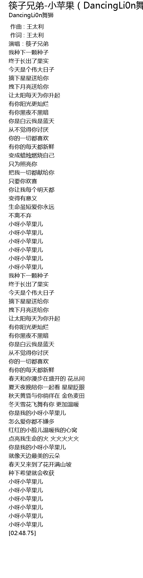 | [01:57.74] | 你是我的小呀小苹果儿 |