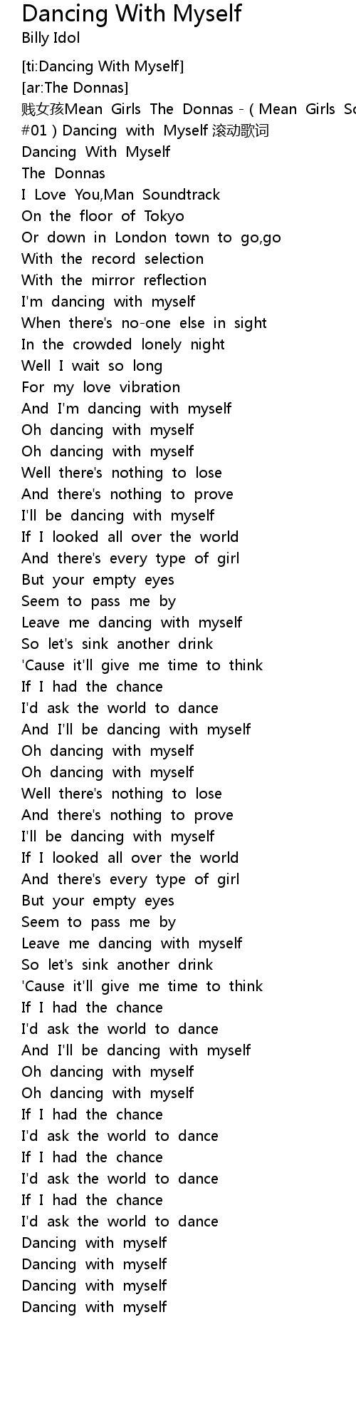 | [00:00.975] | 贱女孩Mean Girls The Donnas -(Mean Girls Soundtrack #01)Dancing with Myself 滚动歌词 |