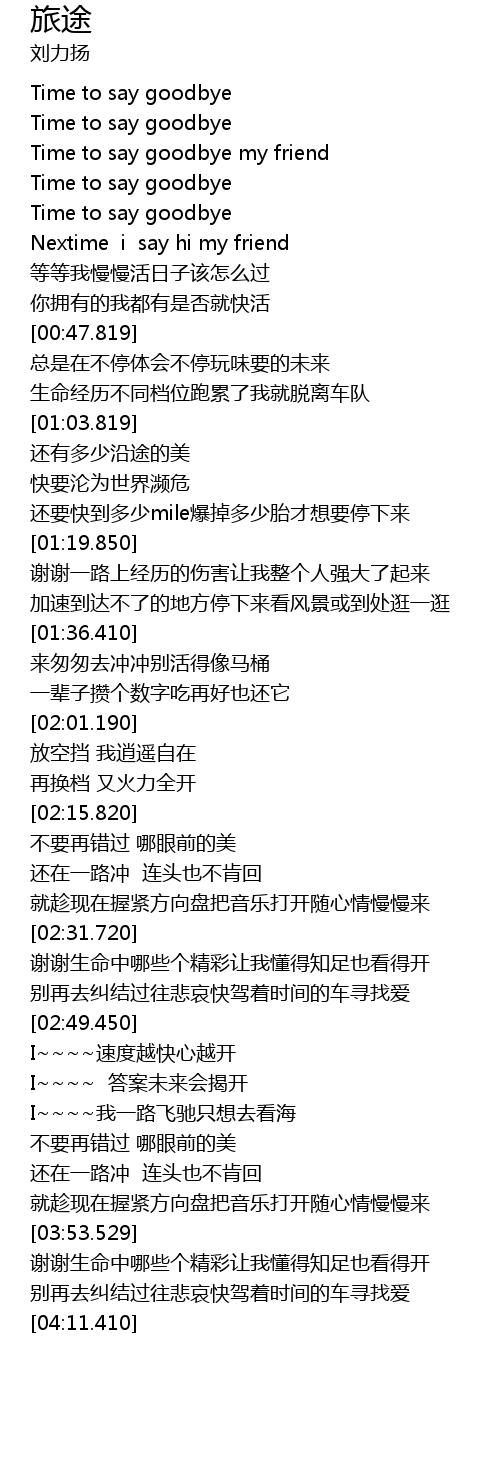 | [04:03.410] | 别再去纠结过往悲哀快驾着时间的车寻找爱 |
