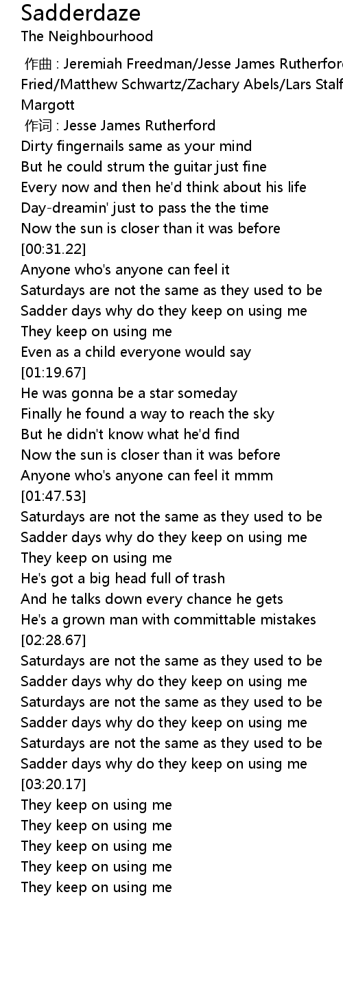 | [01:57.24] | Sadder days why do they keep on using me |