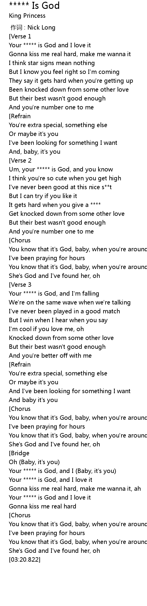 | [02:45.203] | Your ***** is God, and I (Baby, it's you) |