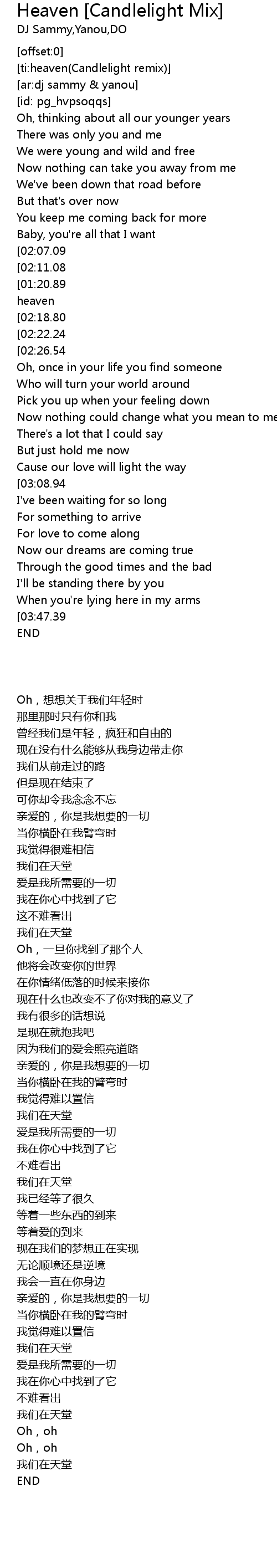 | [01:05.45][01:20.89][02:14.66][02:29.98][03:19.75][03:35.14][03:53.18] | We're in heaven |