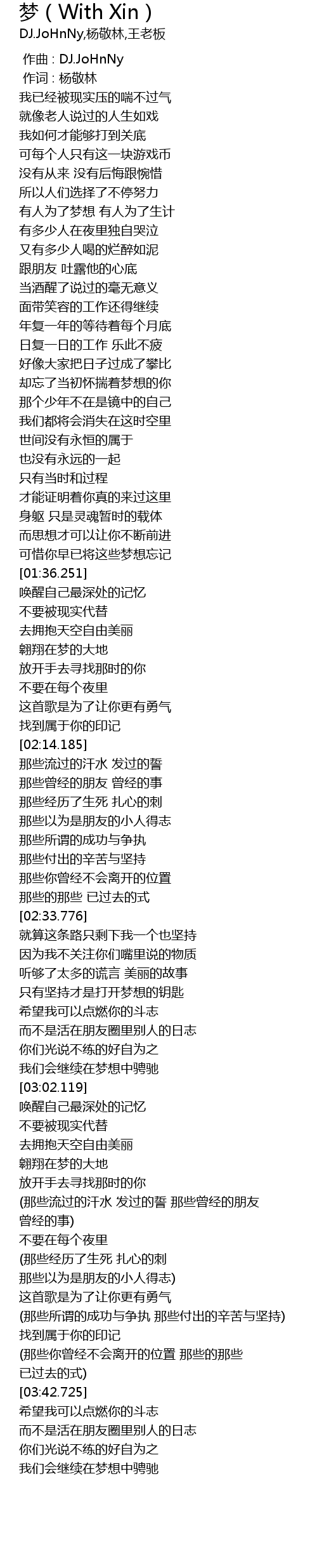 | [01:35.777] | ke xi ni zao yi jiang zhei xie meng xiang wang ji |