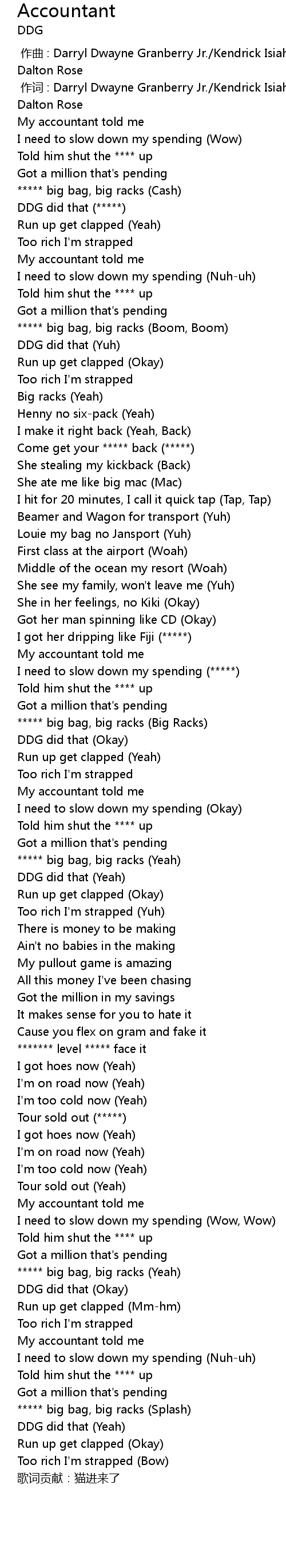 | [01:50.870] | ***** big bag, big racks (Yeah) |