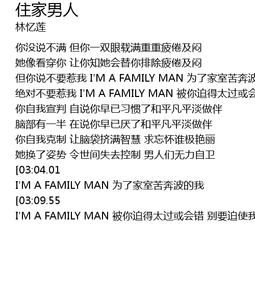 | [03:17.16][03:04.01][02:50.38][02:32.50][02:00.28][01:15.38] | dàn nǐ shuō bú yào rě wǒ I' M A FAMILY MAN wèi le jiā shì kǔ bēn bō de wǒ |