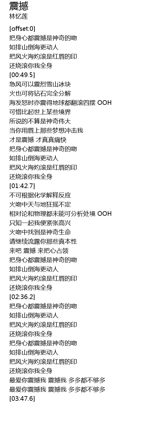 | [03:39.6] | 最爱你震撼我 震撼我 多多都不够多 |