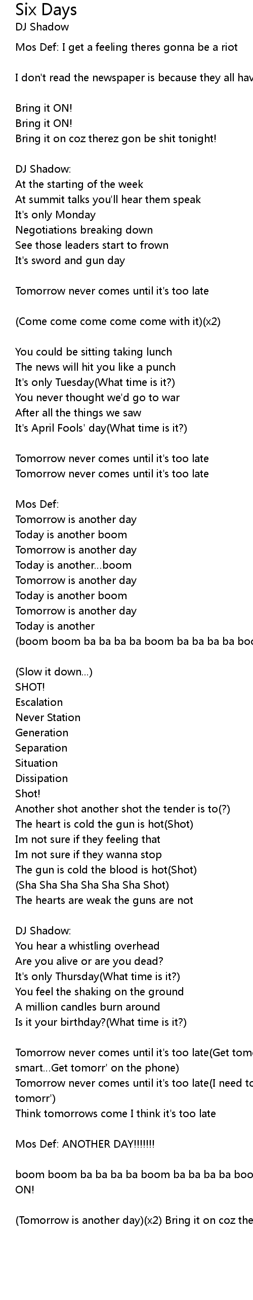 | Tomorrow never comes until it's too late(I need to see tomorr'…Tryna reach tomorr') | |