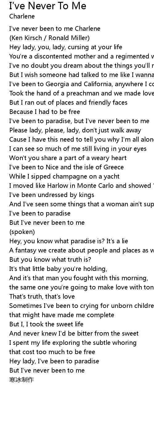| [02:56.82] | Hey lady, I' ve been to paradise |