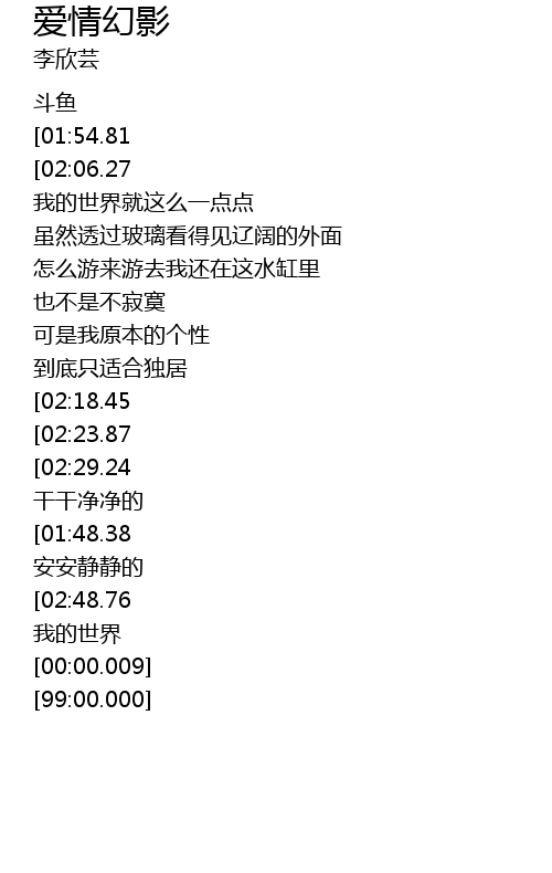 | [00:11.27][01:54.81][03:08.57] | 李欣芸-斗鱼 |