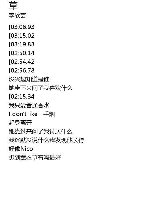 | [00:18.41][03:06.93] | ta zou guo lai you yi zhong cao de xiang wei oh relax |