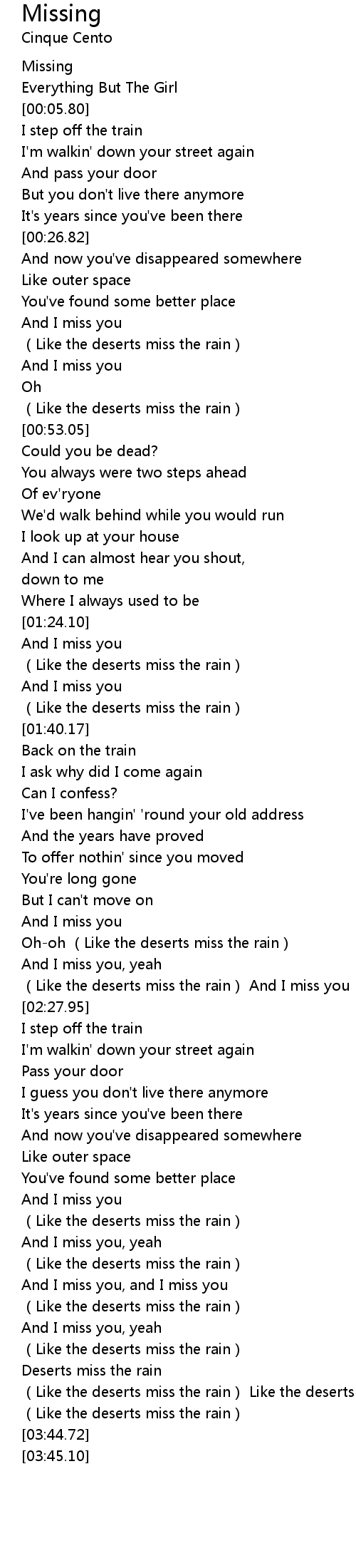| [02:23.19] | (Like the deserts miss the rain) And I miss you |