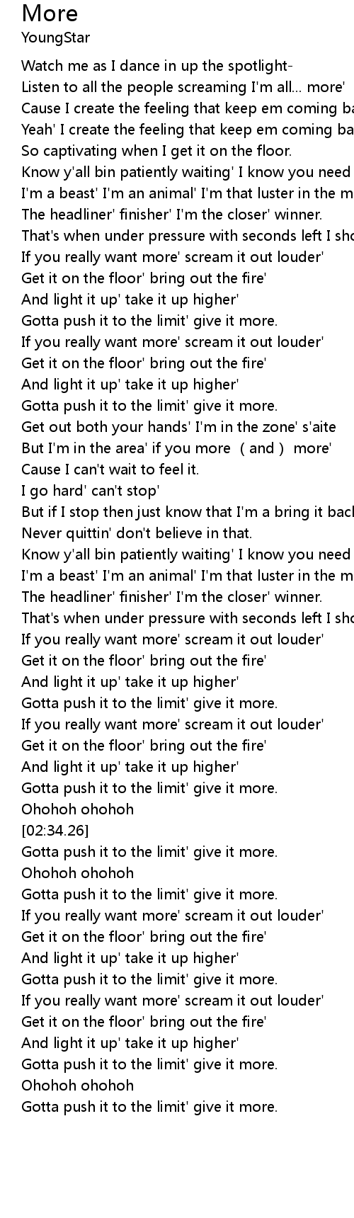 | [02:37.12] | Gotta push it to the limit' give it more. |