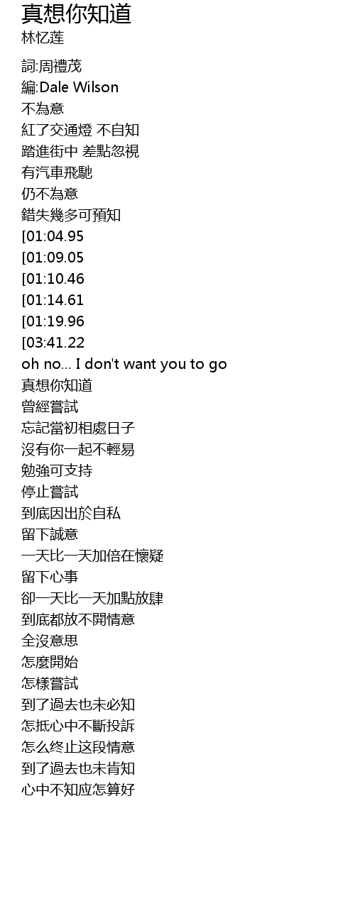 | [04:03.17][03:41.22][02:30.41][01:24.86] | That I don' t want you to go |