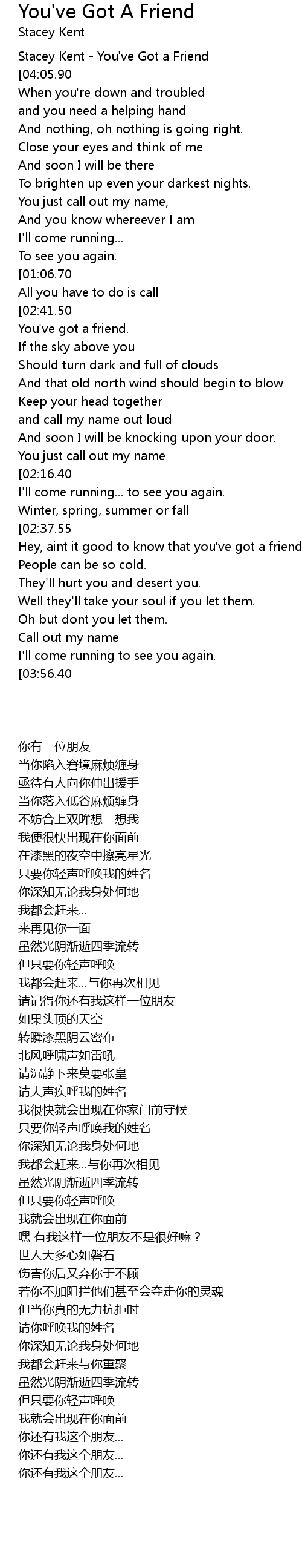 [04:01.75][03:56.40][03:48.10] You've got a friend........