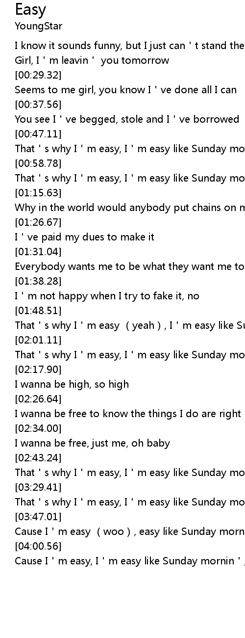 | [01:03.89] | That's why I'm easy, I'm easy like Sunday mornin' |