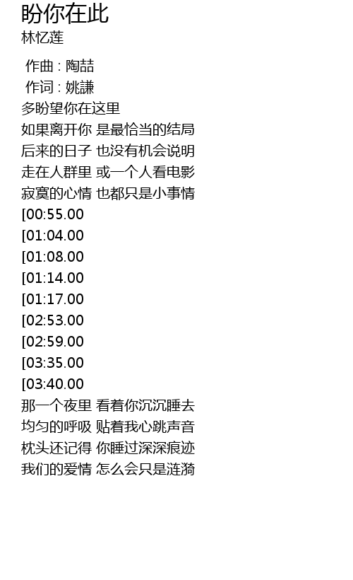 | [03:55.00][02:59.00][01:32.00] | duo pan wang ni zai zhe li |