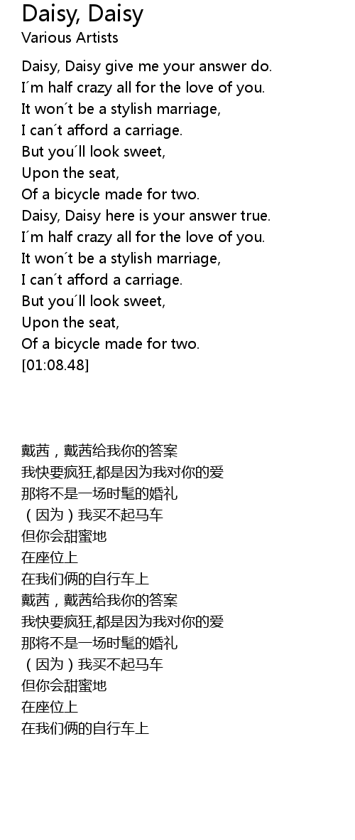 | [00:07.99] | Daisy, Daisy give me your answer do. |