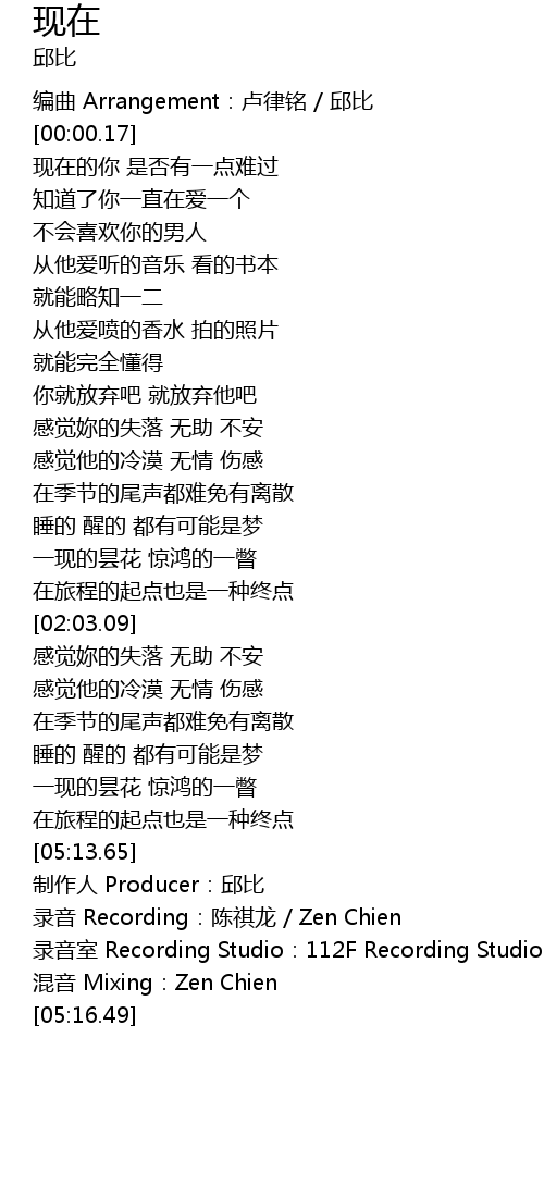 | [00:00.02] | 编曲 Arrangement:卢律铭 / 邱比 |