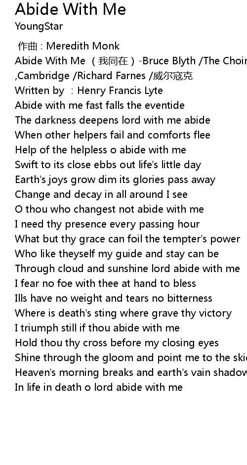 | [00:14.836] | The darkness deepens lord with me abide |