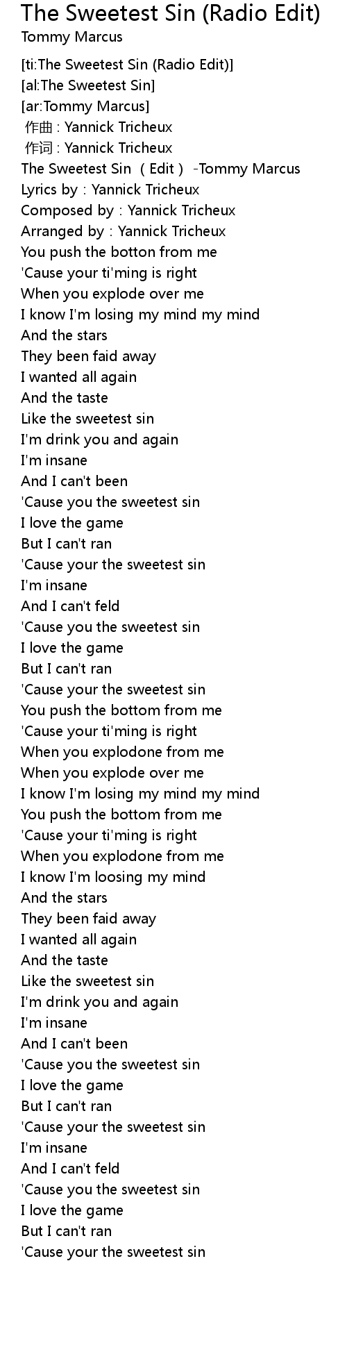 | [00:00.212] | The Sweetest Sin (Edit) -Tommy Marcus |