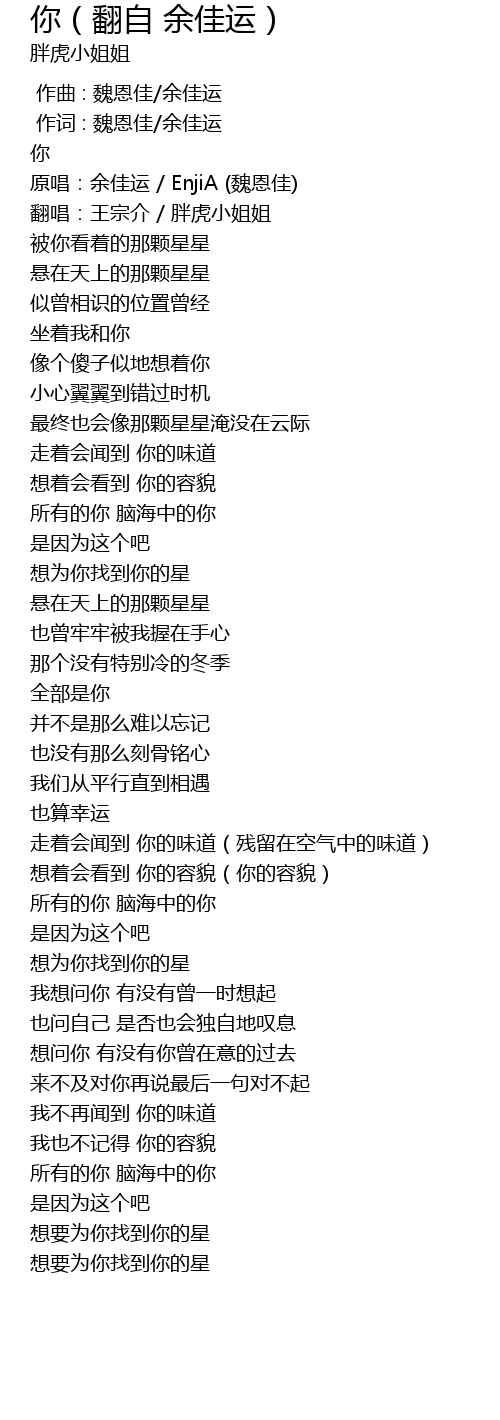 | [00:04.687] | 原唱:余佳运 / EnjiA (魏恩佳) |