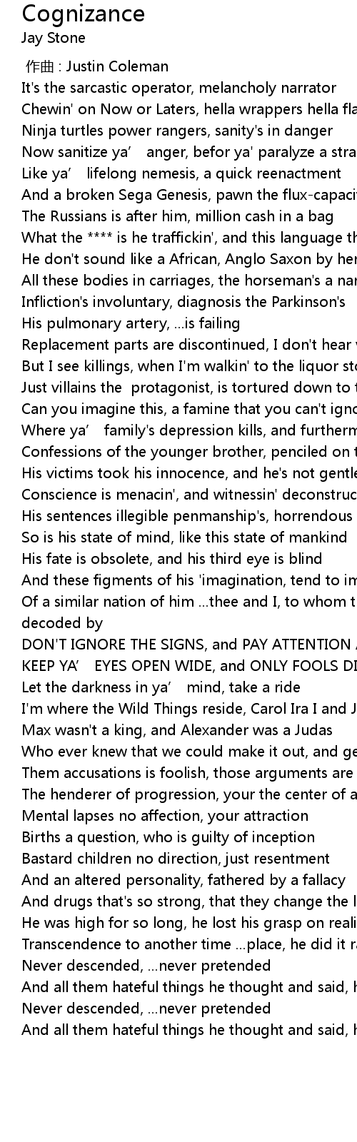 | [01:41.80] | Conscience is menacin', and witnessin' deconstruction |