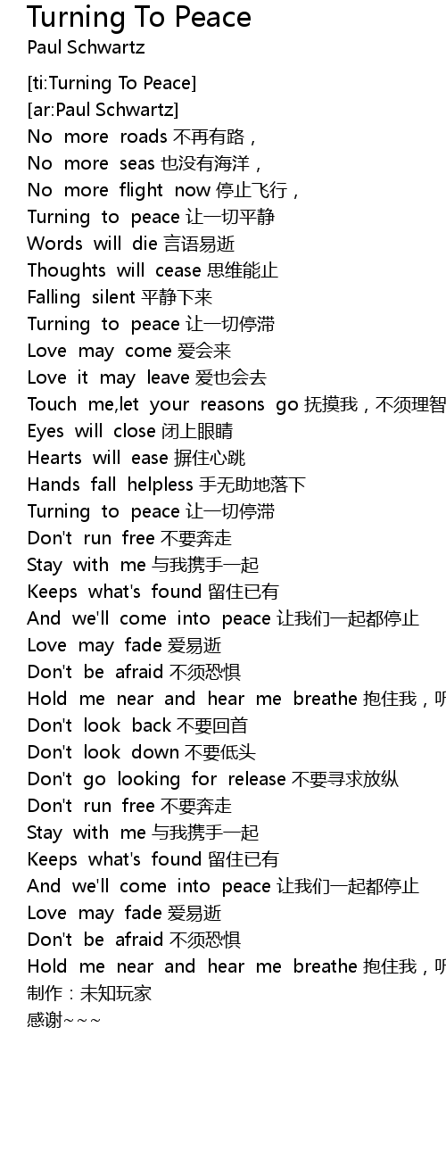 | [01:56.57] | Turning to peace 让一切停滞 |