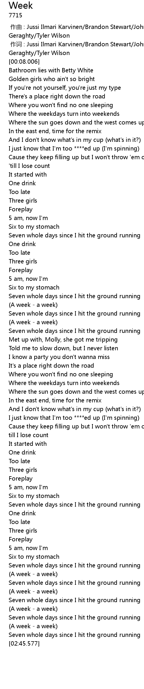 | [02:28.467] | Seven whole days since I hit the ground running |