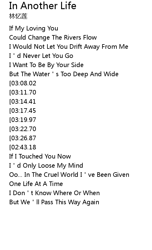 | [03:31.57][03:08.02][02:17.16][01:10.60] | In Another Life |