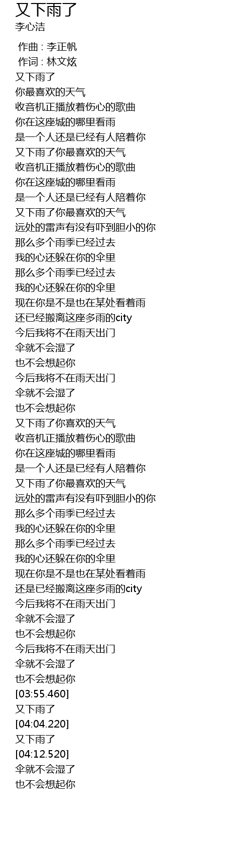 | [04:00.220] | yòu xià yǔ le |