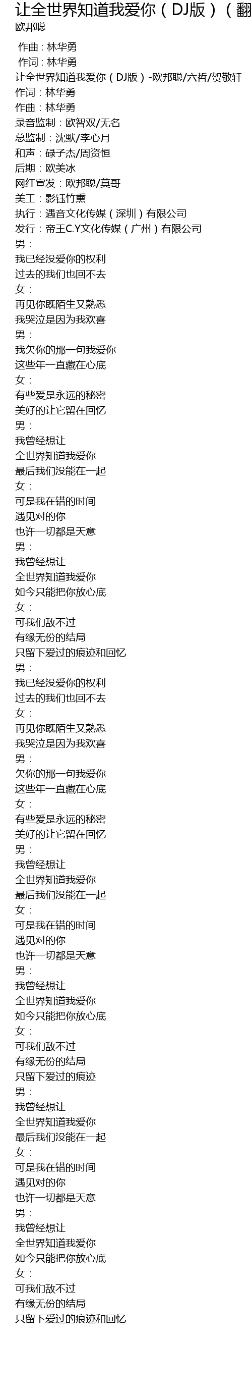 | [00:00.76] | 让全世界知道我爱你(DJ版)-欧邦聪/六哲/贺敬轩 |