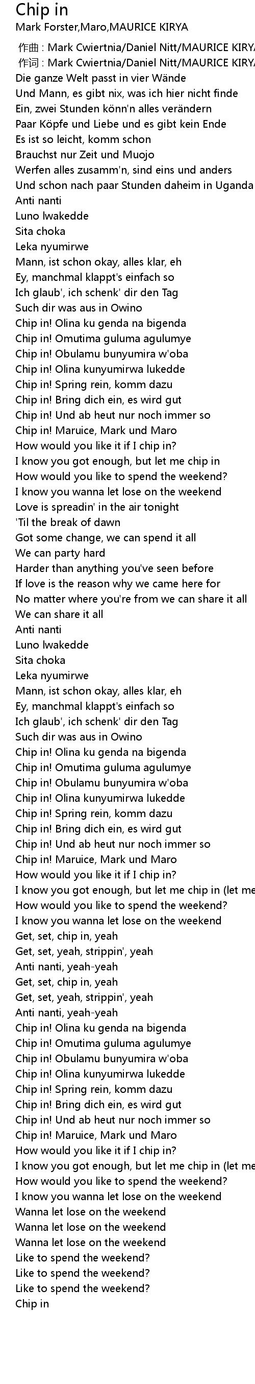 | [00:01.000] | 作词 : Mark Cwiertnia/Daniel Nitt/MAURICE KIRYA/Ronald Magada |