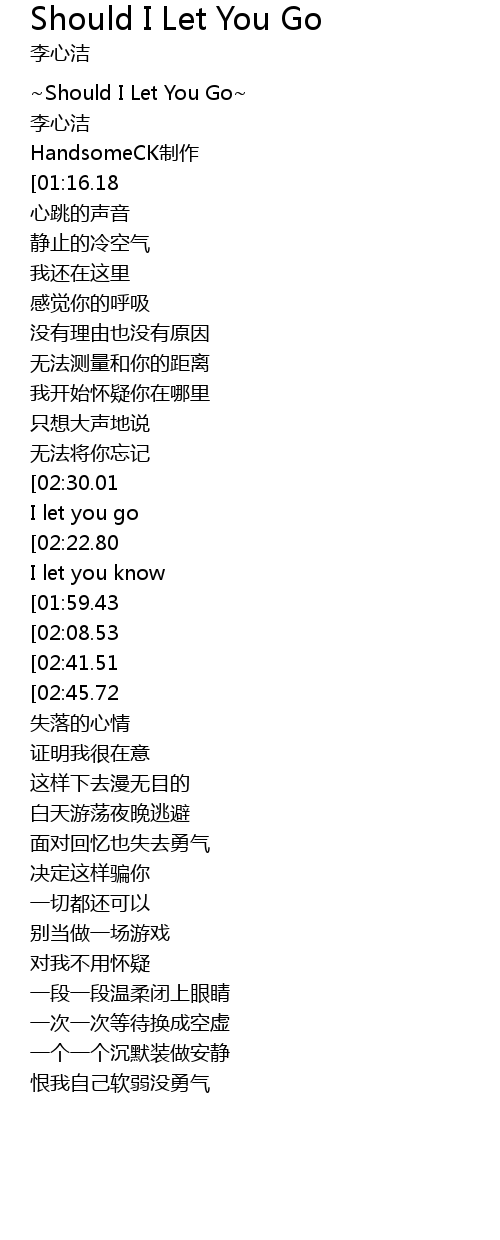 | [02:34.32][02:30.01][02:25.15][02:20.60][02:04.20][01:55.12][01:01.87][00:57.52][00:52.67][00:48.14] | Should I let you go |
