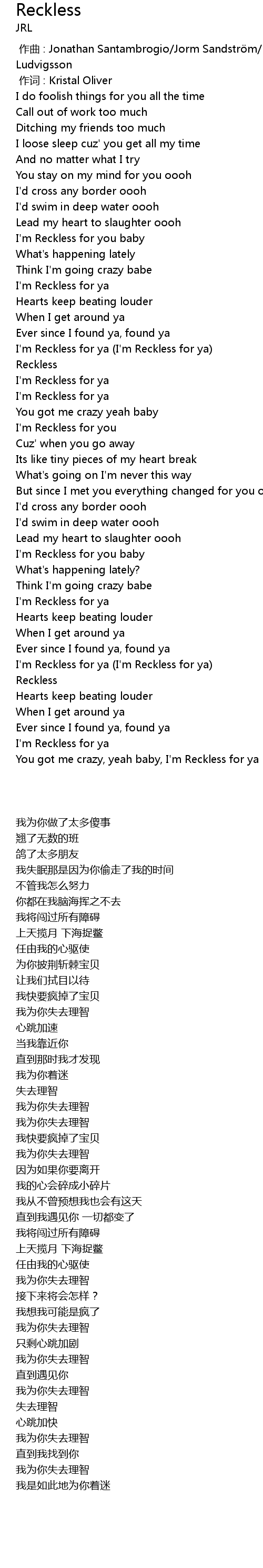 | [02:40.11] | You got me crazy, yeah baby, I'm Reckless for ya |