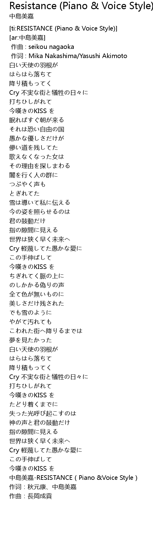 | [04:59.888] | 中島美嘉-RESISTANCE(Piano &Voice Style) |
