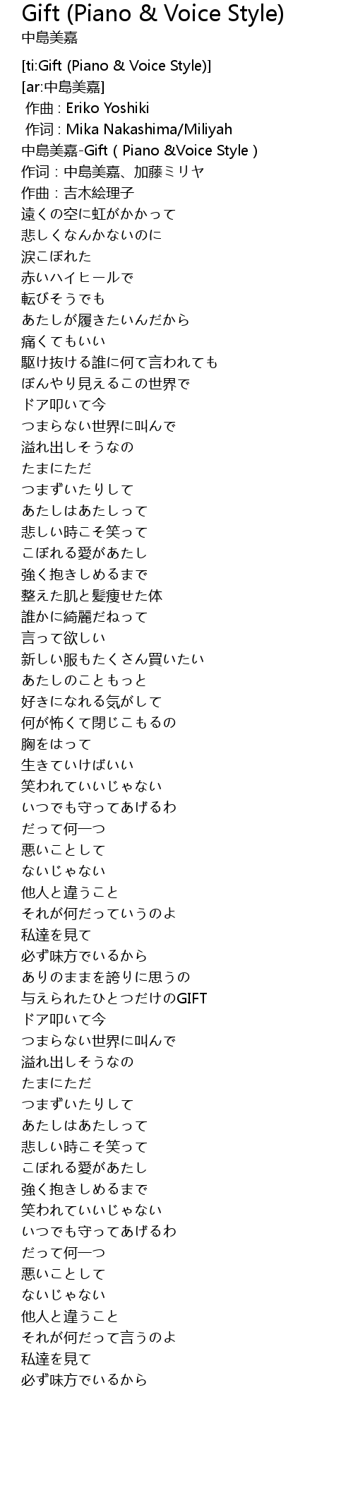 | [00:00.191] | 中島美嘉-Gift(Piano &Voice Style) |